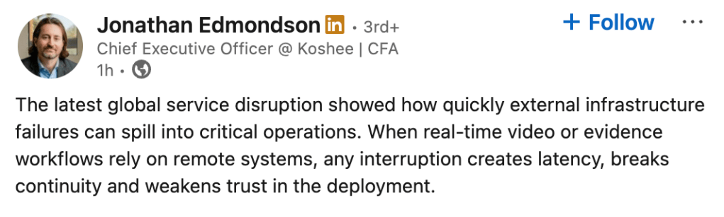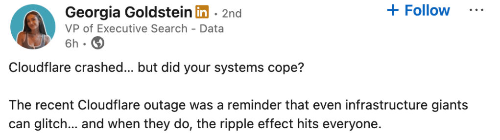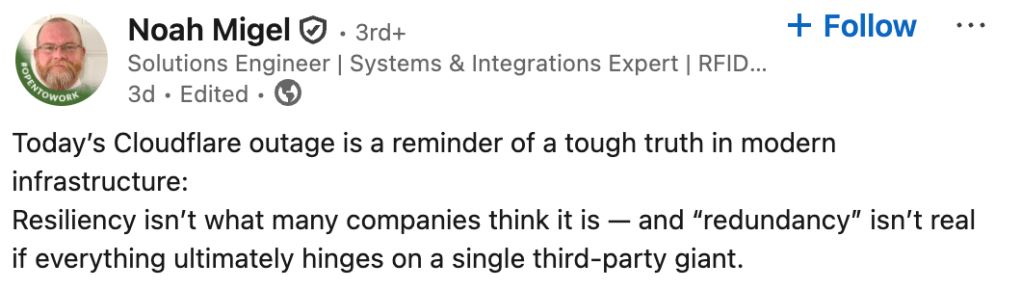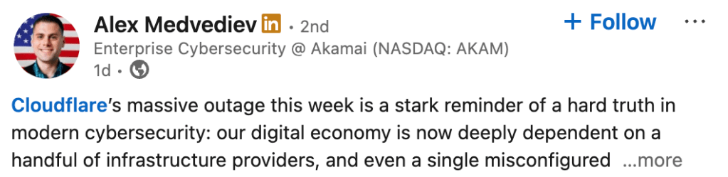 Search linkedin for cloudflare posts about this and you’ll see a bunch of posts from folks on the reminder that the internet is fragile and brittle. Or that folks should be doing XYZ from this.